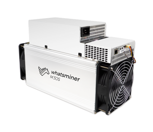 Model Whatsminer M30S from MicroBT mining SHA-256 algorithm with a maximum hashrate of 86Th/s for a power consumption of 3268W.