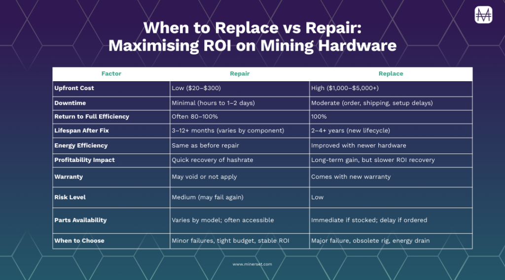 Another key factor is part availability. If replacement parts are easy to source and you or your technicians have the skills to make the repair quickly, then fixing the rig is usually the more economical move. Many miners even keep a stockpile of spare fans, control boards, and power supplies on hand for this reason, to minimise downtime and extend equipment lifespan.